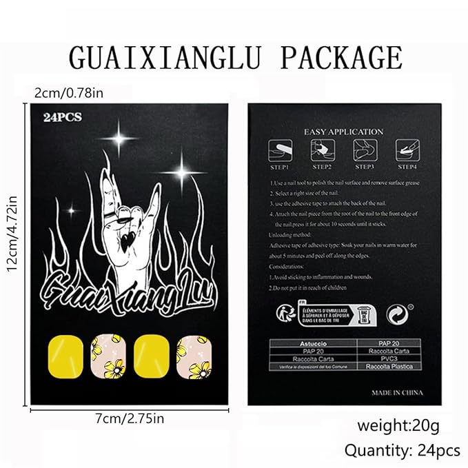 - Package Contains:You will get 24pcs flower fake nails 1pcs nail file 24pcs nail double-side stickers 1 piece nail file 1pcs wooden stick for removing false nails.Jelly glue is not as durable as liquid glue, but it makes yellow fake nails reusable. Please use suitable glue according to different scenes.
