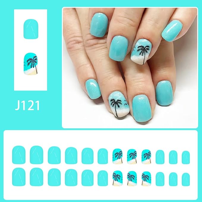 - High Quality & Durable:Full cover square short press on nails are made of high quality acrylic material, the blue press on nails square tips are elastic and durable, not easy to break. The surfaces of the plam tree nails press on square all have a high-gloss protective gel finish, even after multiple uses, the gel and patterns on the nail art surface are not easy to wear