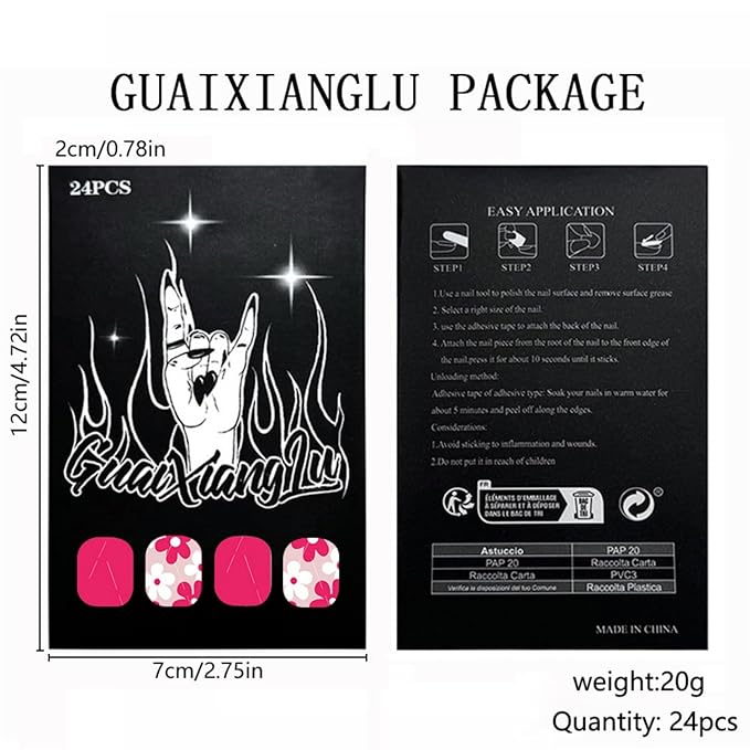 - Package Contains:You will get 24pcs flower fake nails 1pcs nail file 24pcs nail double-side stickers 1 piece nail file 1pcs wooden stick for removing false nails.Jelly glue is not as durable as liquid glue, but it makes hot pink fake nails reusable. Please use suitable glue according to different scenes.