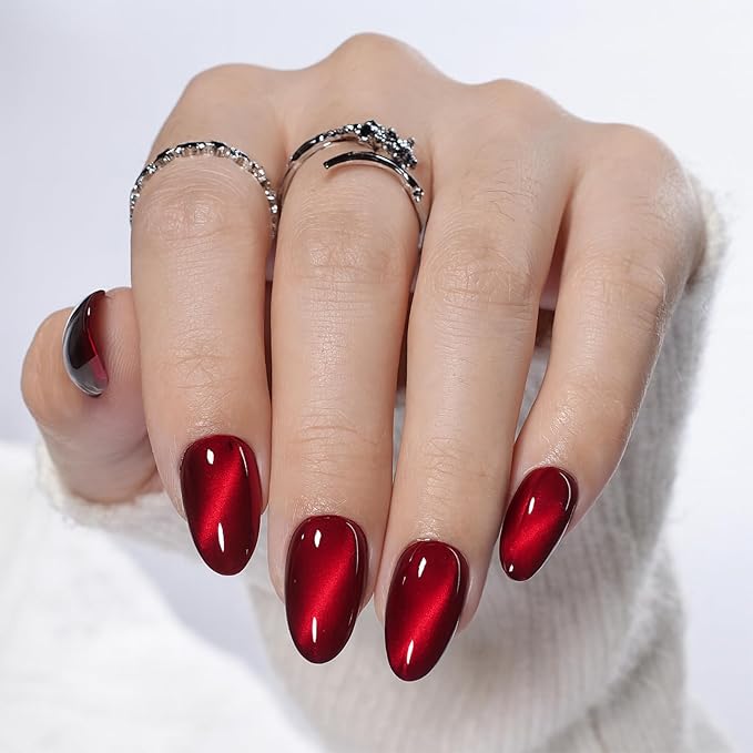 Red Press on Nails, Short Press on Nails Almond Reusable Glossy Cat Eye Nails Soft Gel False Nails Press ons for Women, 16 Sizes 32 Count Nails Kit with Glue (SV-08)
