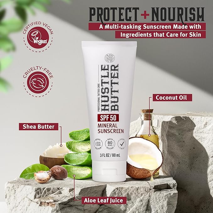 Hustle Butter Tattoo Aftercare Sunscreen - Tattoo Sunscreen Lotion - Fade Protection, SPF 50, Hydrating with Shea Butter & Coconut Oil, TSA-Friendly, Water Resistant, Non-Greasy, 3 oz