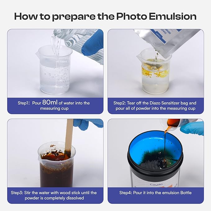 - Large Capacity Photo Emulsion Kit: Coming with a 32-ounce barrel of photo emulsion, 3g diazo sensitizer, a 100ml measuring cup, 1 pair of gloves, 5 wooden stir sticks, and an instruction, large capacity for meet all your screen printing needs