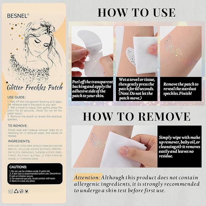 - EASY TO USE: These face glitter freckle patches are easy to use. All you need to do is peel off the backing, apply the glitter freckle tattoo patch to clean skin, The design of the back perspective pattern makes it easy to find the perfect position of freckles on the face. wet the back of the patch, gently press and wait for 60 seconds, peel off the makeup patch, and the natural glittery design will adhere to your skin.