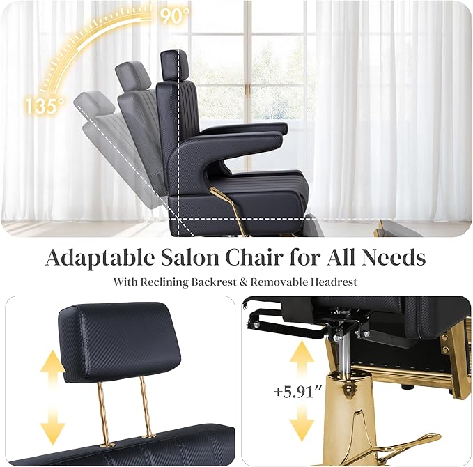 - Multi-Functional Adjustments for All Services: Achieve precise positioning with 360° swivel, 6.5" height adjustment, and 135° reclining backrest. Extendable headrest and flip-down footrest adapt to haircuts, facials, or tattoos, catering to clients of all sizes