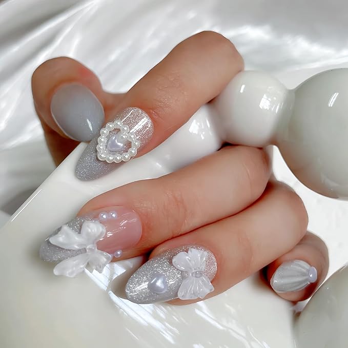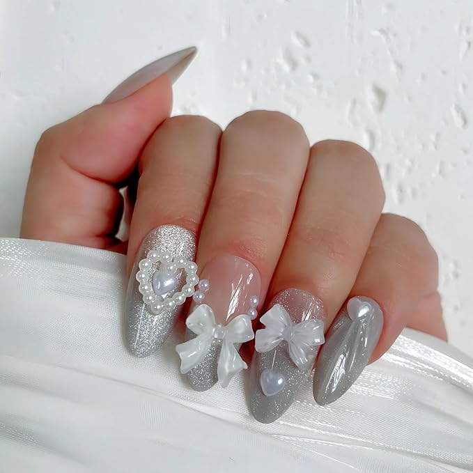 Silver Gradient Cat Eye Press On Nails – 24PCS Medium Almond Fake Nails with 10 Sizes, 3D Floral Design, Reusable Glue-On Nail Tips for Women, Natural Fit for All Occasions