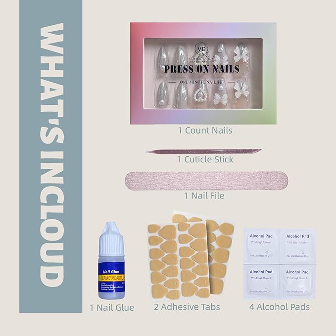 - 【Complete Nail Kit Included】 Comes with everything you need: 12.7 cm nail file, 3g strong nail glue, 2 kraft adhesive tabs (1 large + 1 small), 4 alcohol pads, and a cuticle stick.