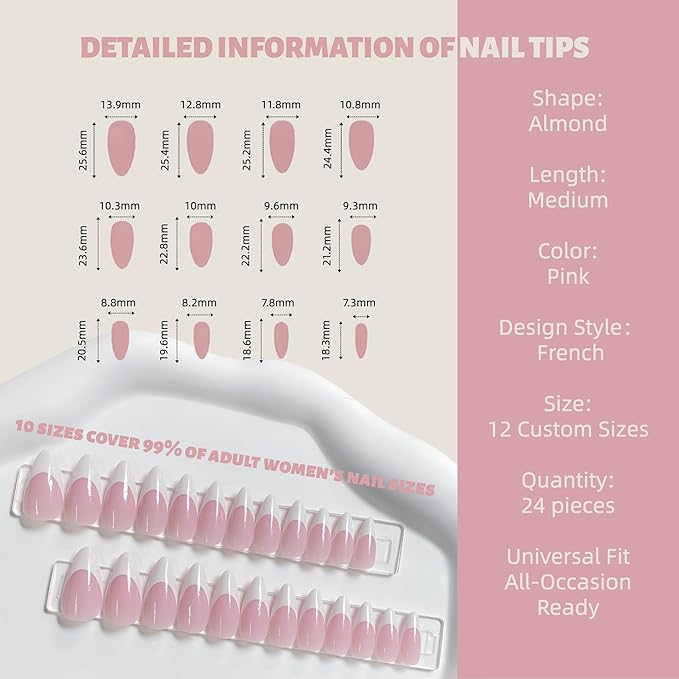 Medium Almond French Pink Press on Nails – 24PCS Glossy False Nail Tips in 12 Sizes | Soft Fit Back Edge & Hard Front | Glue on Acrylic Nails for Women | Reusable & Natural Look