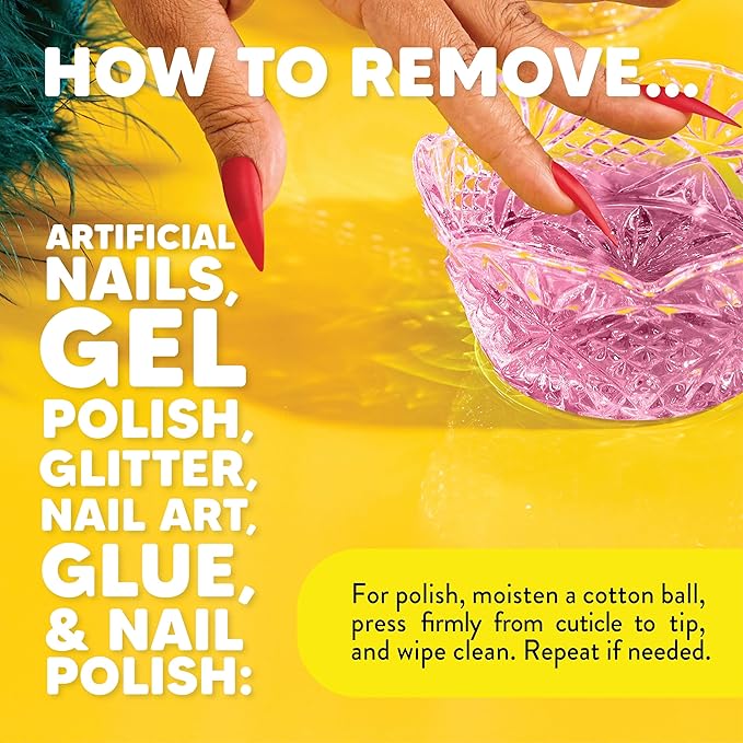 - Directions: Simply clip the artificial nails, and soak your fingers in a bowl of the nail remover for 15 minutes. Gently file down the softened product and soak for another 15. For regular polish, Moisten cotton balls and massage the nail bed
