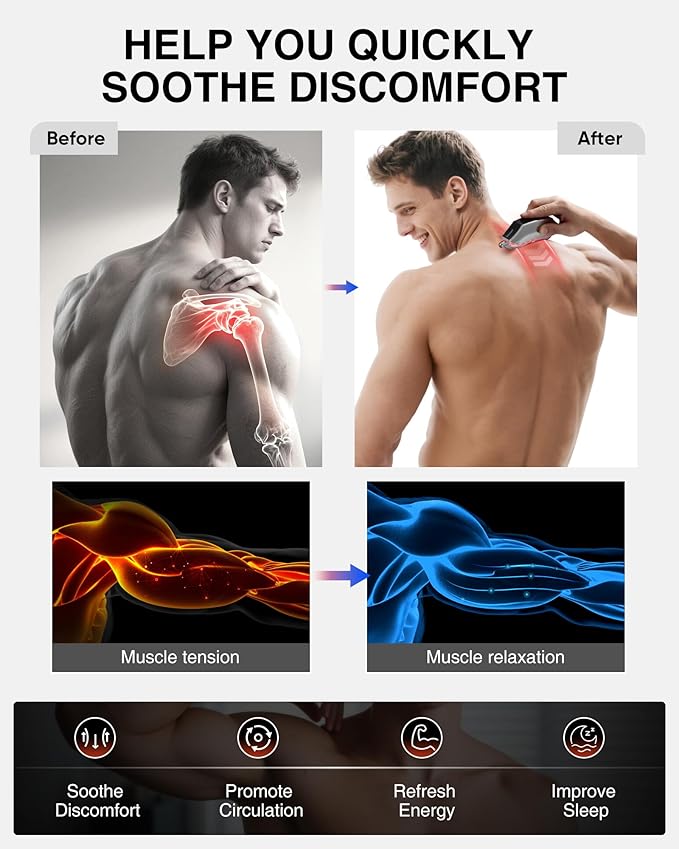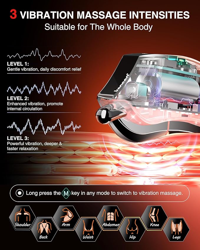 - 【3 VIBRATION MASSAGE INTENSITY & 3 HEATING】This electric massage scraper tool with 3 different vibration massage intensities and 3 different temperatures are available for you to choose. You can choose according to your own needs, allowing you to experience different comfort experiences. Whether you're seeking post-workout relaxation after intense training, combating muscle stiffness from long hours of sitting. (Note: It works on deep relaxation, so it is normal that the surface sensation is not strong.)