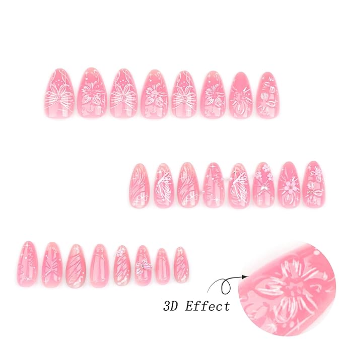 24Pcs Pink Press on Nails Medium Almond Fake Nails with 3D Flower Butterfly Designs Stick on Nails Bow False Nails Spring Summer Floral Acrylic Nails Gold Bead Glue on Nails for Women Nail Supplies