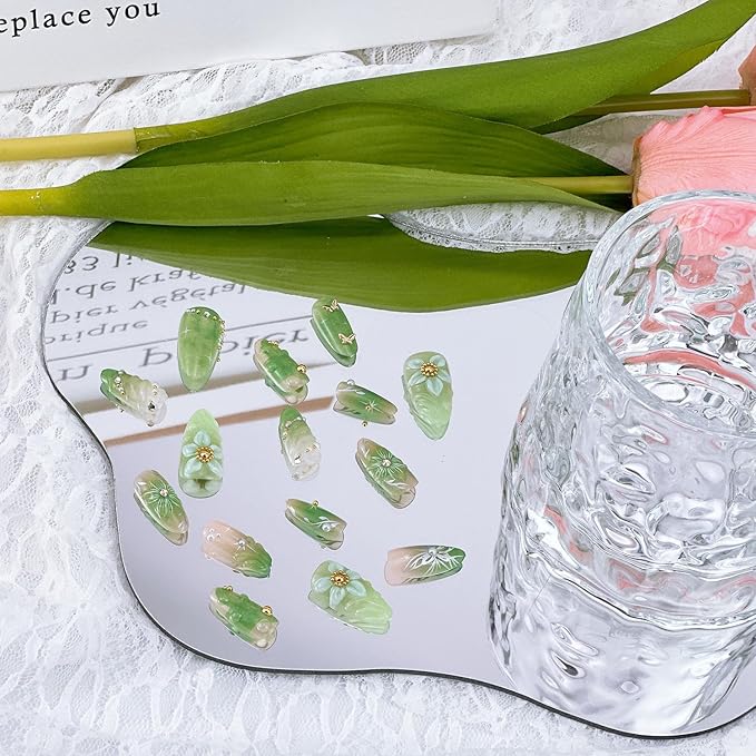30Pcs Green Press on Nails Medium Almond Fake Nails with 3D Pearl Gold Beads Designs Stick on Nails 3D Flower Butterfly False Nails Spring Summer Acrylic Nails Silver Star Glue on Nails for Women