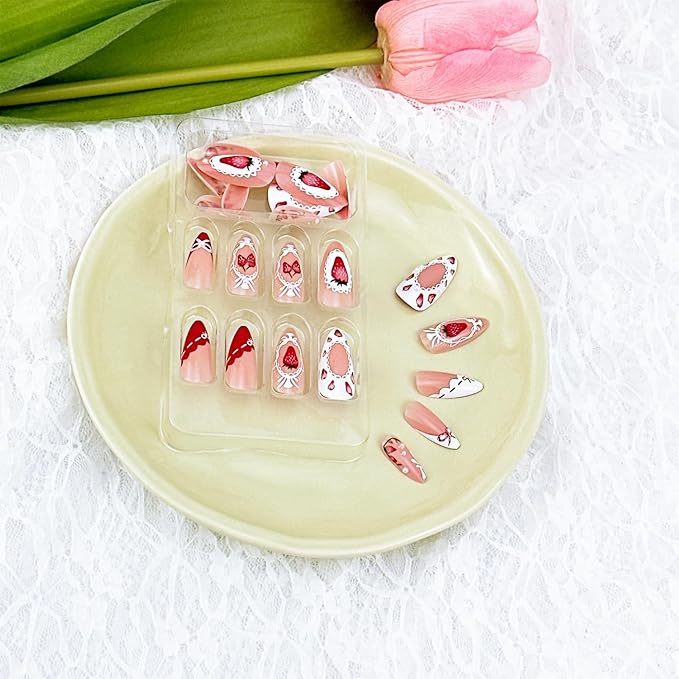 - Strawberry Kit for Nails: Each set includes 24pcs almond press on nails medium, 24pcs adhesive nails tabs, 1 wooden stick, and 1 nail file. Everything you need for a salon-quality manicure at home