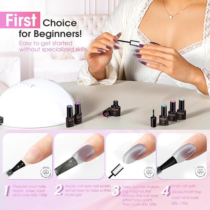 - WHAT YOU GET: ROSALIND Cat Eye Gel Polish - 8 vibrant cateye jelly shades (5ml each) for magnetic cat eye transparent effects. Compact bottles (5.6cm H x 2.7cm W) are perfect for travel & trying new colors. Achieve long-lasting gel nails anywhere