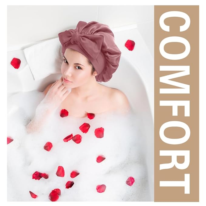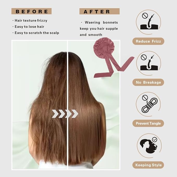 - VERSATILE USE:This satin bonnet for sleeping also convenient for washing, showering and skincare, No matter makeup, cleaning, cooking, studying, working etc.It's lightweight, won't add much extra weight on your head. Hand wash in cold water and air dry to extend bonnet life
