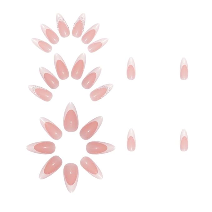 Press on Nails French Medium, Pearl White Fake Nails Almond Acrylic False Nails,Artificial Glue on Nails for Women 24pcs