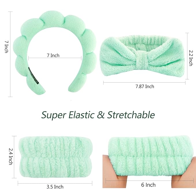- What you get: The package has four wrist bands, a spa sponge headband, and a bow shape on the top of the spa headband, which makes your face wash easier and simpler