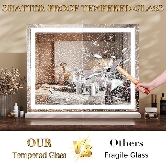 - 【Large Size with Full View】 This LED lighted makeup mirror measures 23" x 18", offering an expansive view to frame your entire face—perfect for detailed makeup application or styling. The slim design fits seamlessly on desks, vanities, or countertops, saving space while providing a professional-grade beauty setup. Transform your daily routine with a mirror that balances functionality and compactness.