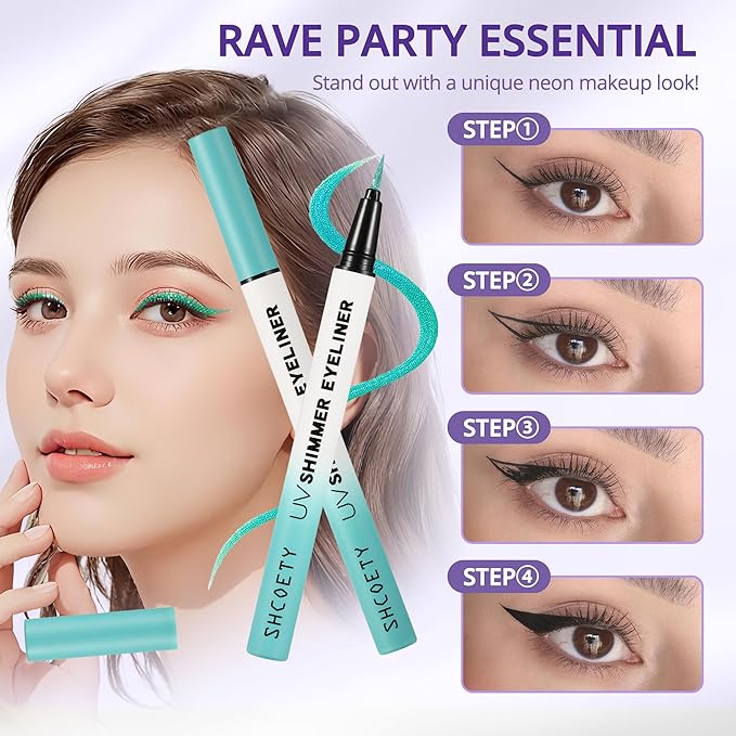 - SHIMMER NEON EYELINER - These eyeliners not only have shimmer,but also have fluorescence in the liquid eyeliner, and it will have a fluorescent effect under the irradiation of the ultraviolet lamp. The color of the liquid eyeliner under normal light or sunlight is as shown on the package.