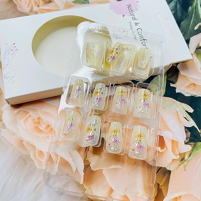 - High-quality False Nails:The medium square false nails with designs, are made of ABS materials.The glossy full cover stick on nails reusable with moderate thickness are not easy to break,use the nail glue sticker we gave you, summer glue on nails is brings you a comfortable experienc