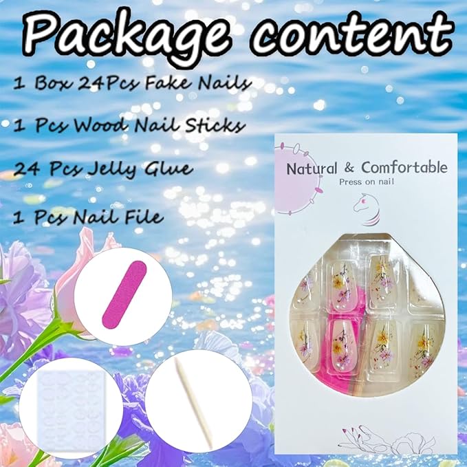 - Flower Acrylic Nails Kit: There are 24 pcs of floral press on nails 12 different sizes, 1 mini nail file, 1 small wooden stick, 1 nail sticker in the package.(Jelly glue doesn't last as long as liquid glue, but it can make fake nails reusable. Please use suitable glue according to different occasions)