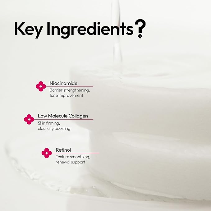 - Triple-Action Formula for Youthful Skin: Packed with low molecular Collagen (300,000 Da) for elasticity, Retinol for fine lines, and Niacinamide for brightness, ideal for daily use to visibly improve tone, texture, and firmness.