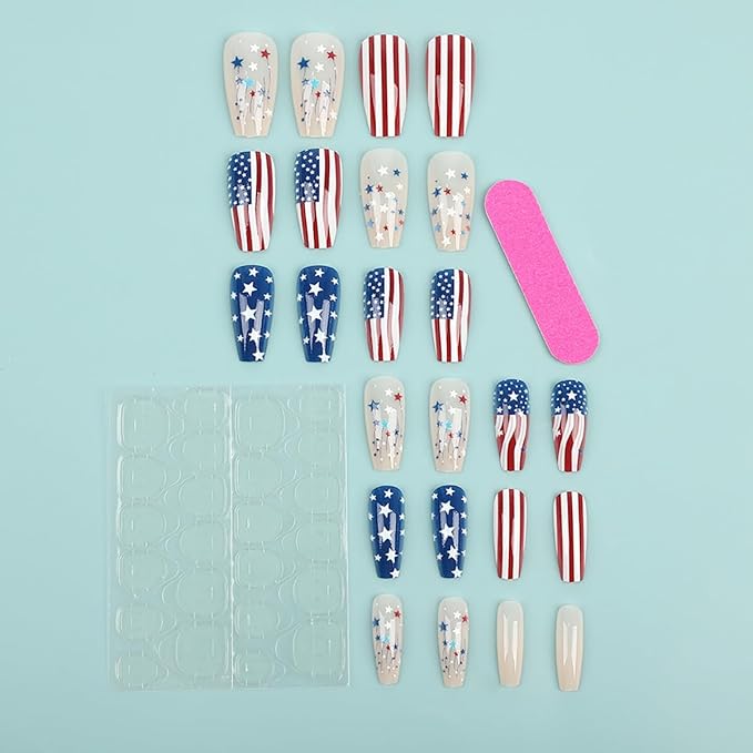 - Package: You will get 24 pieces Independence Day false nails, 1 piece nail file, 1 piece nail double-side stickers, 1pcs wooden stick for removing nails tips; There are 12 different sizes of fake nails; You can choose the most suitable fake nails for yourself