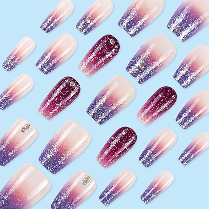 Purple Ombre French Tip Press on Nails Short Coffin Fake Nails with Rhinestones Design Glitter Acrylic Nails Press ons Cute Gradient Glue Stick on Nails for Women 24 Pcs