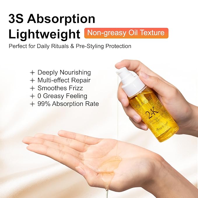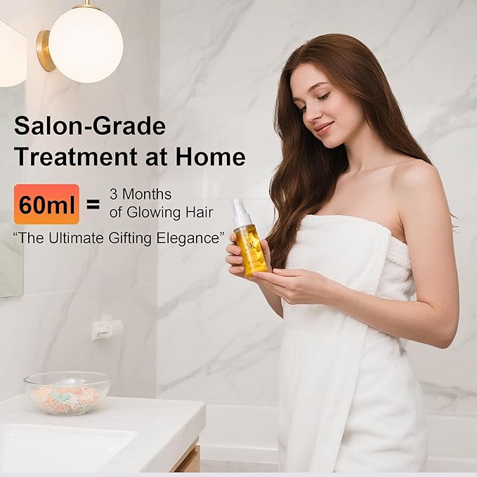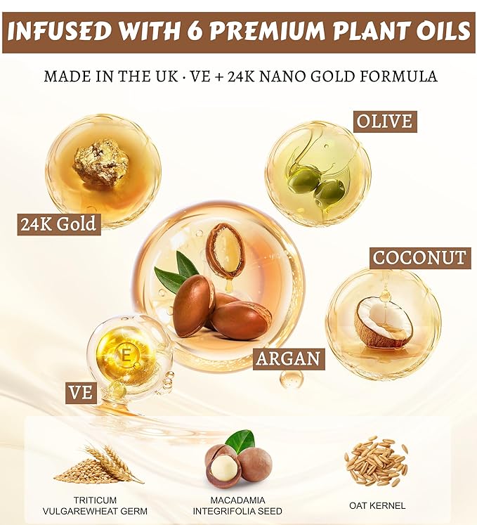 - Deep Repair with 6 Botanical Oils + 24K Gold: A luxury blend of argan, coconut, olive, macadamia, wheat germ, and oat kernel oils—infused with 24K gold and vitamin E. Nourish dry, damaged hair, reduce breakage by 95%, and restore shine & elasticity. Ideal for color-treated, heat-damaged, or chemically processed hair