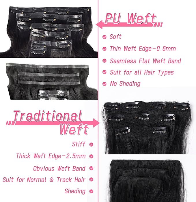- Natural Black Real Human Hair Extensions – Soft, Silky & Tangle-Free: Essent PU clip-in extensions are made from 100% Remy human hair for a salon-quality look and feel. Shed-resistant and smooth to the touch, they blend naturally with your own hair. Curl, straighten, or dye with ease — perfect for weddings, dates, and special occasions