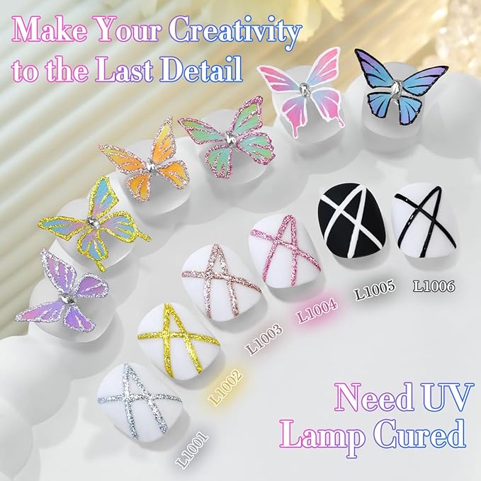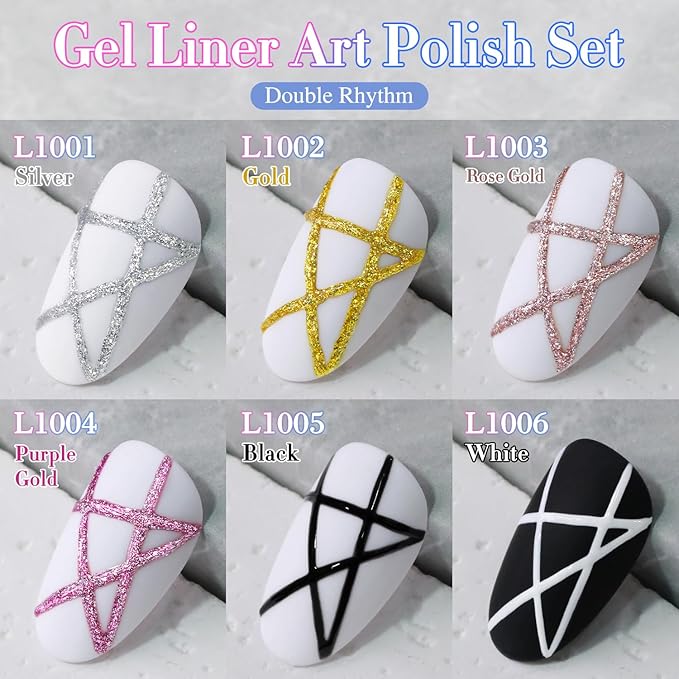 - 6 Pcs Gel Liner Art Polish: 6pcs 15ml gel polish for all season, will come with color swatches.These gel polish kit need to be cured under UV or LED Lamp for 60-138s. Must apply with Base Gel and Top Coat. Please shake the bottle or warm it with hot water before use, to acheive a better effect.