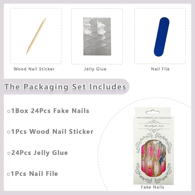- Package About: The box contains 24pcs long press on nails, a nail file and 24 jelly glues, 1 wooden stick, the almond shaped false nails are divided into 12 different sizes, it is convenient for you to choose the one that suits you nails.