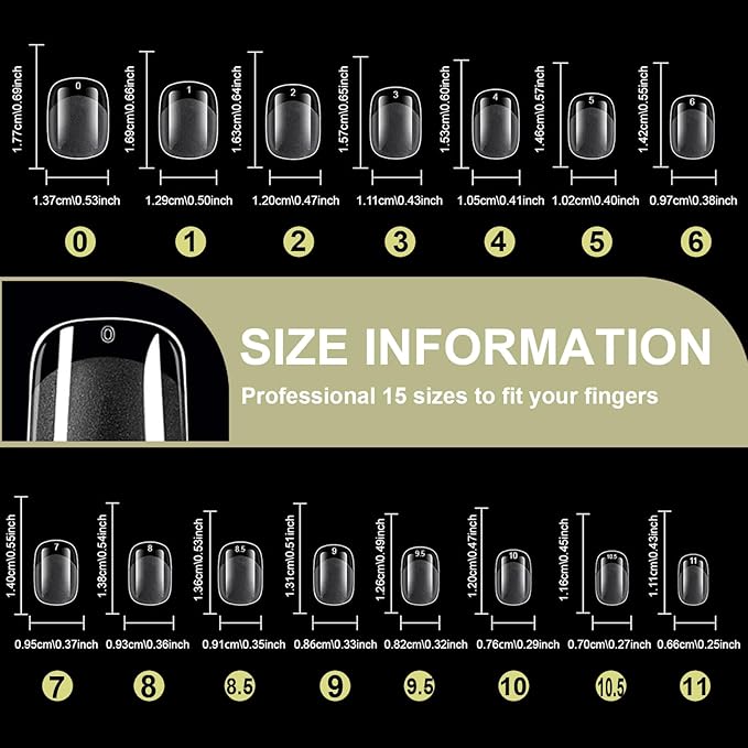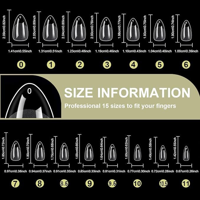 - ASSORTED 2 SHAPE NAILS: 2 popular shapes - almond and squoval, each shape of nails are 300pcs and 15 sizes, pre-numbered marked on the tips. With the professional US nail size database, whether you have a wide flat or narrow nail bed, you'll find the perfect size