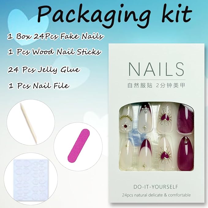 - Heart Bow Pearl Rhinestones Fake Nails Kit Package: There are 24 pcs of medium almond press on nails12 different sizes, 1 mini nail file, 1 small wooden stick, 1 nail sticker in the package.(Jelly glue doesn't last as long as liquid glue, but it can make fake nails reusable. Please use suitable glue according to different occasions)
