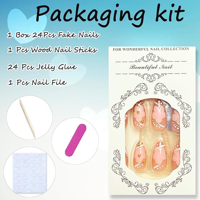 - Short French Tip Fake Nails Kit Package: 24 pcs summer press on nails (12 sizes), nail glue tabs, a mini nail file, and a small wooden stick—everything you need for a salon-quality manicure at home! Ours full cover acrylic stick on nails feature delicate floral designs, perfect for effortless glam.
