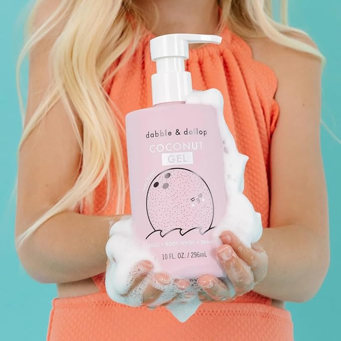 - Versatile 3-in-1 Coconut Cleanser: Transform your child’s bath routine into a lush tropical oasis with Dabble & Dollop's All Natural Coconut 3-in-1 Shampoo, Body Wash, and Bubble Bath. Our premium, plant-based formula is designed to gently cleanse while maintaining their skin and hair's natural moisture balance, leaving them feeling soft, smooth, and infused with a delightful, exotic coconut scent. Ideal for all skin and hair types, this hydrating hair and body wash is both cruelty-free and vegan, making it a responsible choice for the environment and your family.