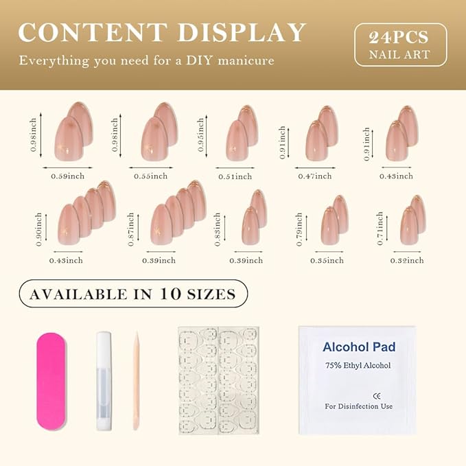 - Press On Nails Short Kit: Our premium set includes 24 press on nails short almond, jelly adhesive tabs, mini nail files, nail glue, and a wooden cuticle stick. Perfect for creating chic French Tips Press-on Nails Short designs or bold short almond French Tip press on nails