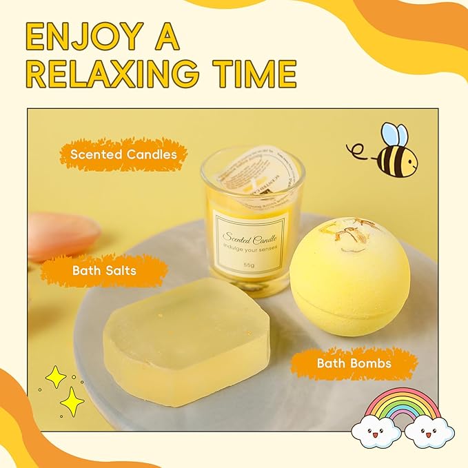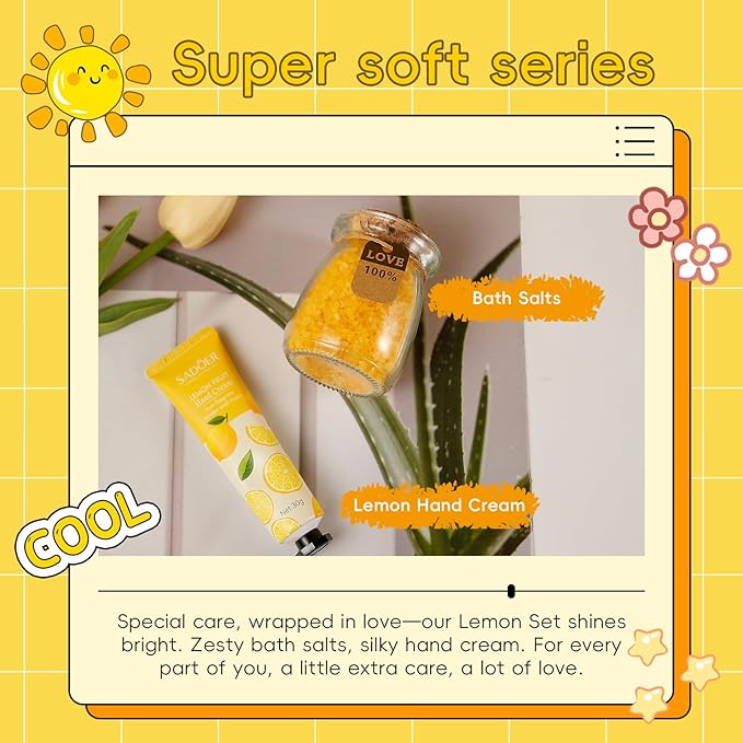- Perfect Gift for Women: Our lemon-inspired gift basket features a vibrant, fun, and high-quality collection: 1 x Lemon Bath Salt, 1 x Lemon Soap, 1 x Lemon Hand Cream, 1 x Scented Candle, 1 x Silk Eye Masks, 1 x Chamomile Bath Salt, 1 x Headband + 2 x Wristbands, 1 x Beautiful Greeting Card