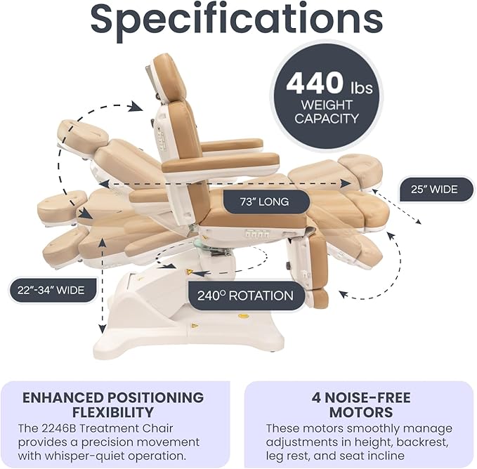 - PROFESSIONAL FACIAL CHAIR FOR SPECIALISTS: This premium spa chair features 240° rotation capability, making it perfect for facial services. It has a dimensions of 73"×33"×23-35"H, and base size of 40"×30"×2.5" (narrows to 24" at foot end). Holds up to 440 lbs, making this facial bed suitable for all clients. Medically approved chair that combines functionality with luxurious feel for any medspa, salon, or clinic.