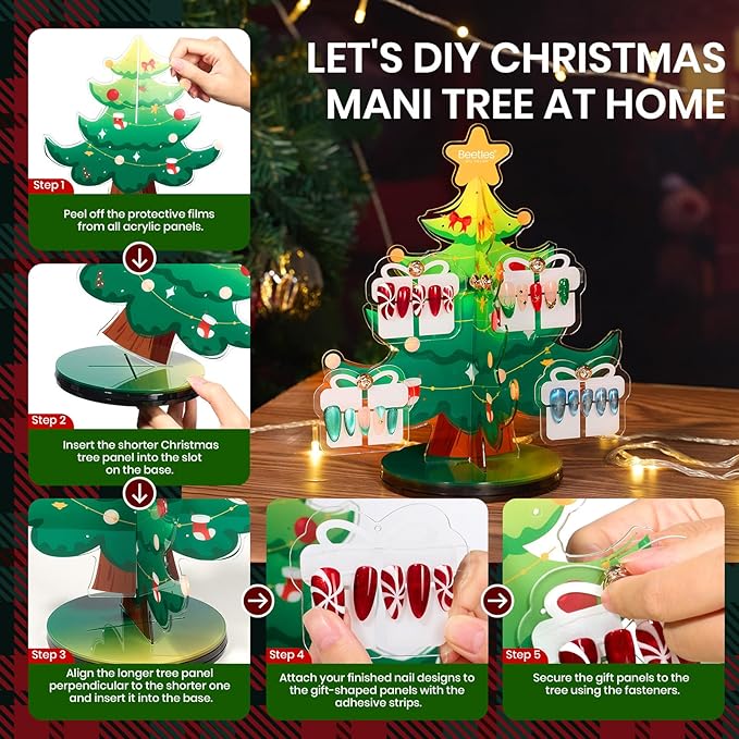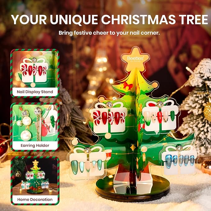 - Exquisite Christmas Tree-Shaped Display Stand: Each side of this stand features holes, allowing users to display the press on nails fake tips, hang earrings and jewelry. We've included essential accessories to add a touch of Christmas cheer to your desktop. The stand is also revolving. Simply push the acrylic panels, instead of constantly lifting the stand. We're committed to optimizing your experience. And you can practice and make the Christmas nail art designs on the small nail stand.
