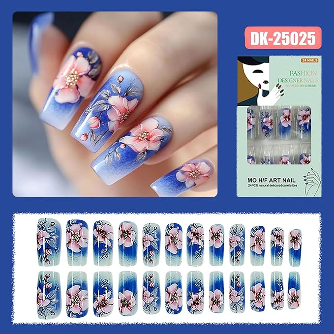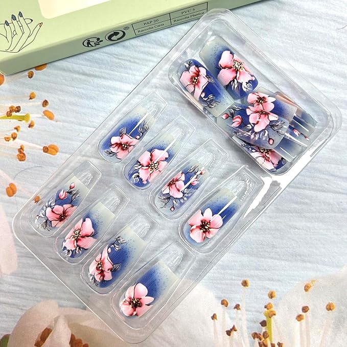 Flower Press on Nails Long Ballet Shaped Blue Gradient Acrylic Fake Nail Peony Floral Pattern Design Full Cover Glossy Artificial Fingernails Blossom Stick on Nail 24Pcs Glue on Nails for Women
