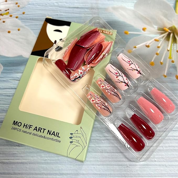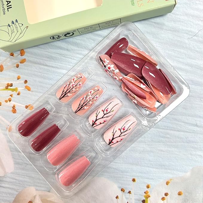 - Fake Nails Design: Our artificial nails use pink plum bossom design style, give you grace feeling, pretty and comfortable press on nails will give you good mood and add luster to you