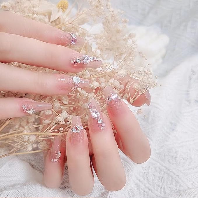 Medium Press on Nails Coffin Fake Nails with Rhinestones Glitter Designs Glue on Nails Light Pink Transparent Nails Press ons Medium Coffin False Nails Artificial Stick on Nails for Women 24Pcs