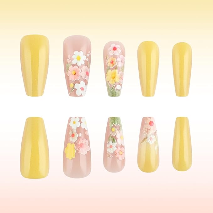 Press on Nails Medium Coffin Fake Nails with Color Floral Designs Glue on Nails Yellow Full Cover Nails Press ons Glossy False Nails Cute Artificial Stick on Nails for Women 24Pcs