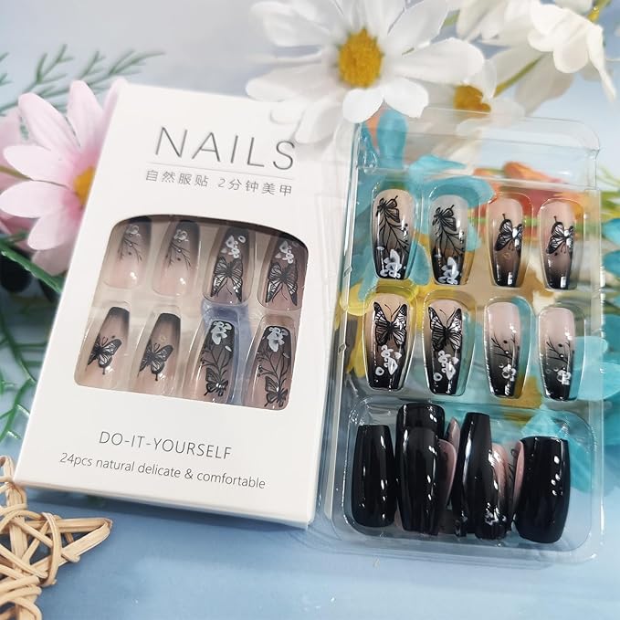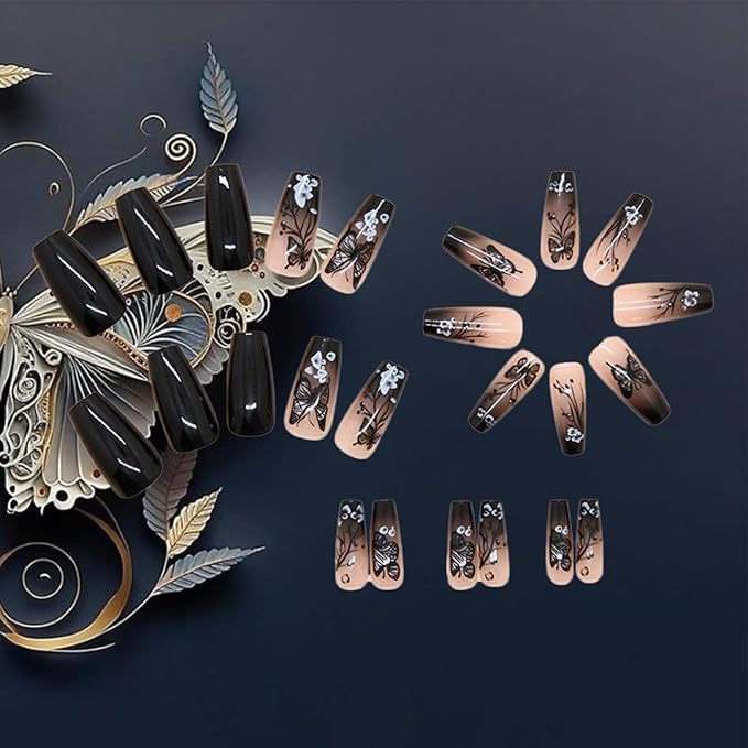 - Kind Tips: Black butterfly press on nails package does not contain nail glue, the durability of jelly gum is limited, we suggest you use your own glue