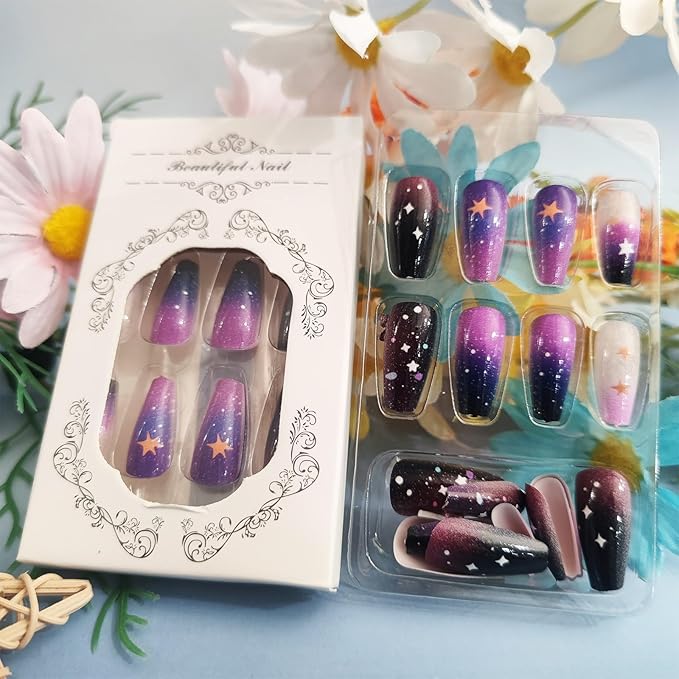 - Kind Tips: Starry sky press on nails package does not contain nail glue, the durability of jelly gum is limited, we suggest you use your own glue