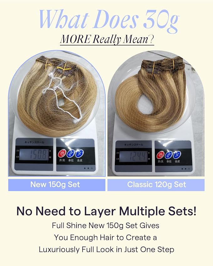 - Upgraded 150g Volume for Fuller Hair: Compared to Full Shine classic 120g set, this thick clip in extension weighs 150g, giving you extra density. This set is ideal for customers with medium to thick hair or anyone who desires a dramatically fuller style in minutes