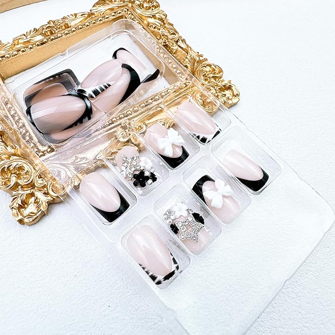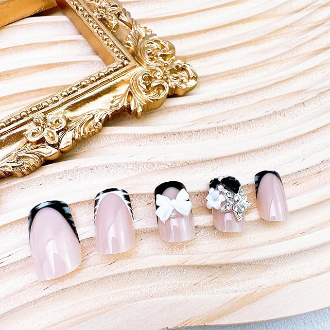 24pcs Black French Tip Press on Nails Short Square Bow Fake Nails with 3D Black White Flower Star Rhinestones Designs Glue on Nails Leopard French False Nail Tips Full Cover Stick on Nails for Women