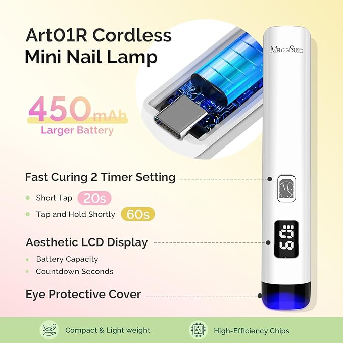 - Rechargeable & Portable: This Handheld UV Light offers the convenience of our 450mAh battery-powered cordless UV Led nail lamp! With a single charge, enjoy up to 14 days of use. But also features a unique transparent protective cover that safeguards the lens while ensuring retina is shielded from strong UV light. This has 2 timers setting for choice, short press for 20s timer setting, turn off and press then hold for 2s Switch to 60s timer setting. Notice:If the UV light doesn't turn off, please press and hold the button for 5 seconds.