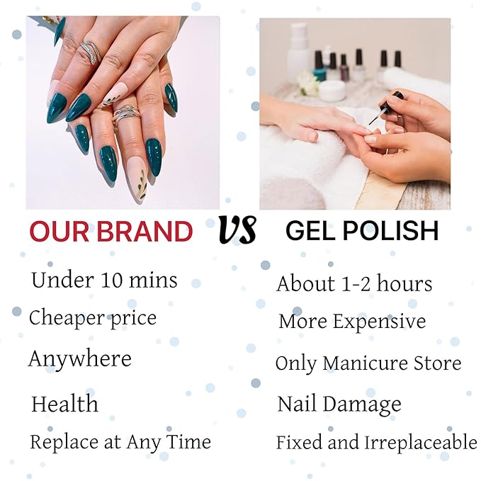 - Quick Application: Easy to apply press-on nails There is no need to go to the nail salon, Acrylic nails can be changed in a few minutes,and Glue on Nails it is easy to remove, so that you can easily create your exclusive nails.
