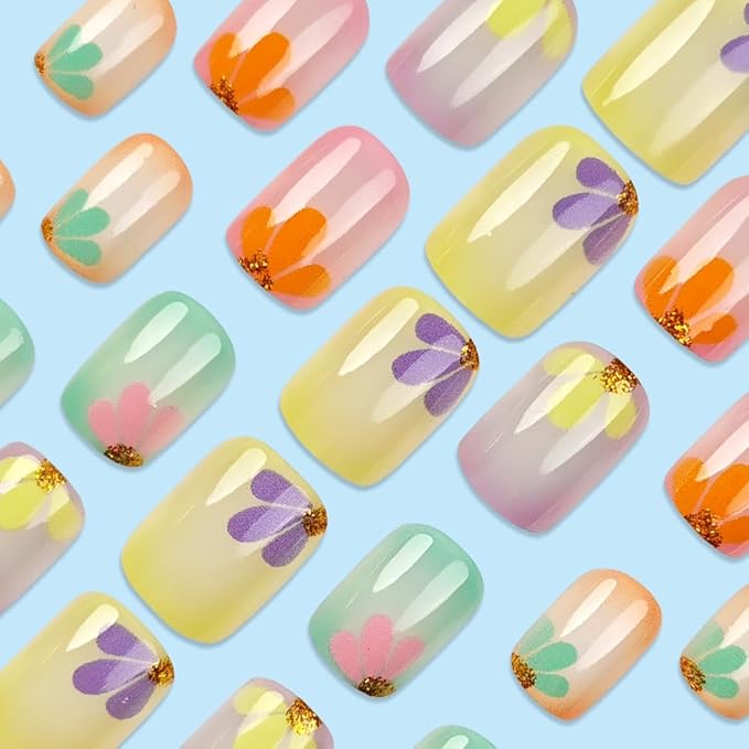 Square Press on Nails Short Fake Nails Colorful Artificial Nails Full Cover Acrylic Press on Nails with Glitter Petal Designs False Nails Cute Stick on Nails for Women Girls Nail Art Decoration 24PCS